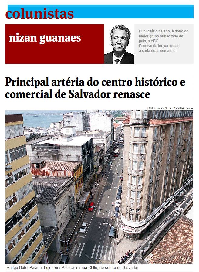 Great article by Nizan Guanaes, an icon of Brazilian advertising, praising the renovation of the Palace Fera Hotel and Rua Chile in Salvador – the first street of Brazil.