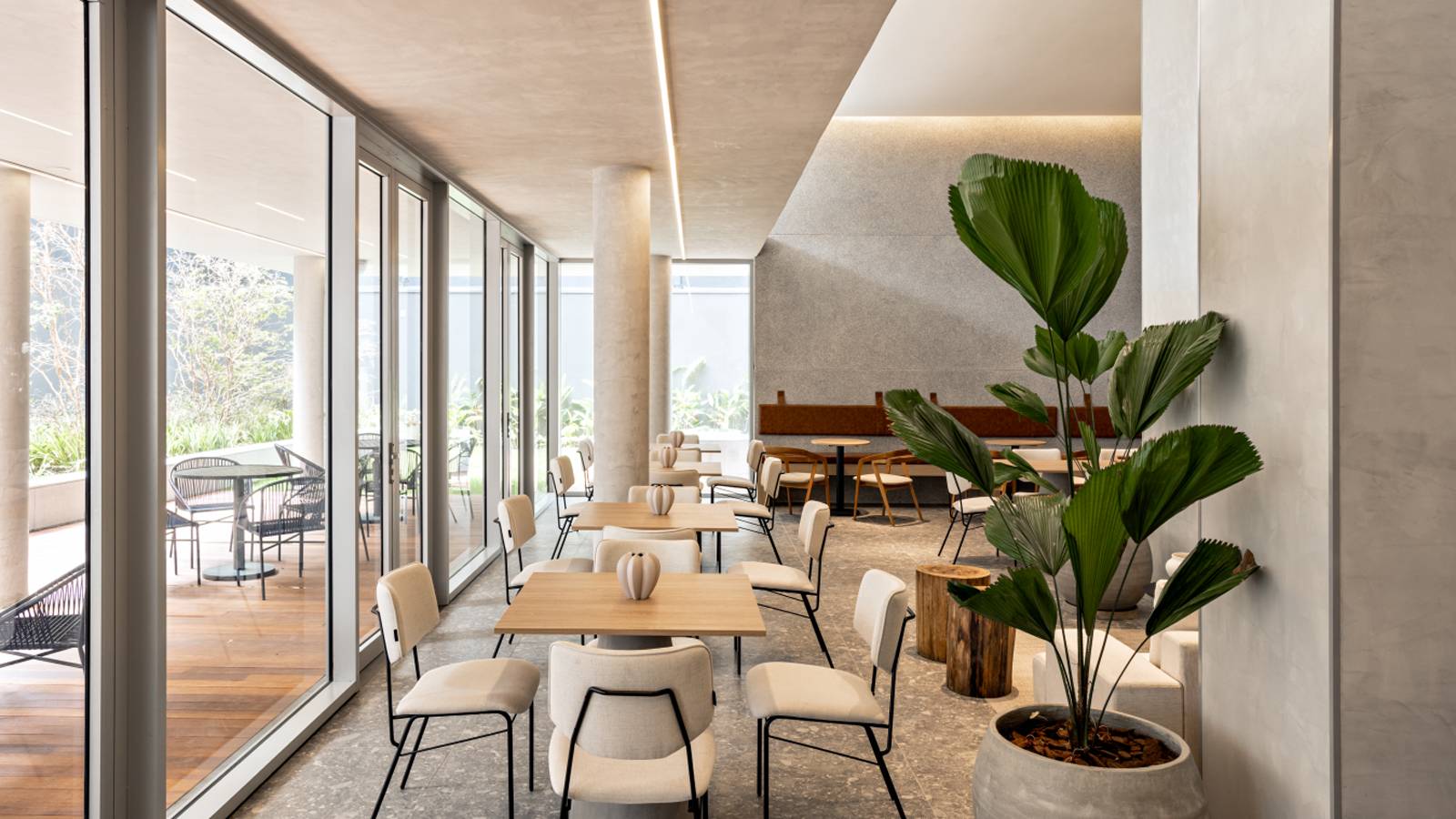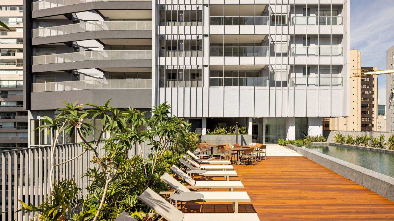 The residential spaces are intimately connected to the city through a peaceful outdoor area, suspended above the city, offering a panoramic view of the São Paulo skyline.